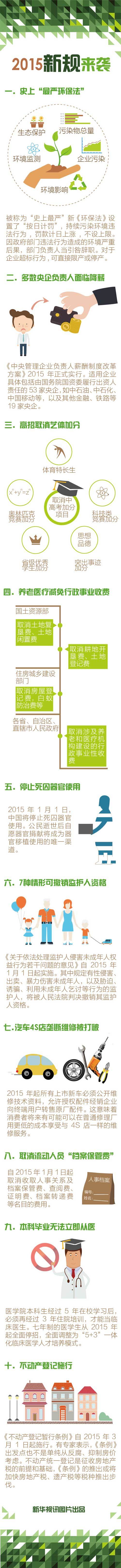 新年伊始,又有一批国家级新规发布实施。快来看看,哪些与你有关?2015年1月1日起,十二届全国人大常委会第八次会议表决通过的《环保法》修订草案正式施行。新《环保法》对企业惩治力度大大加强。违法排放污染
