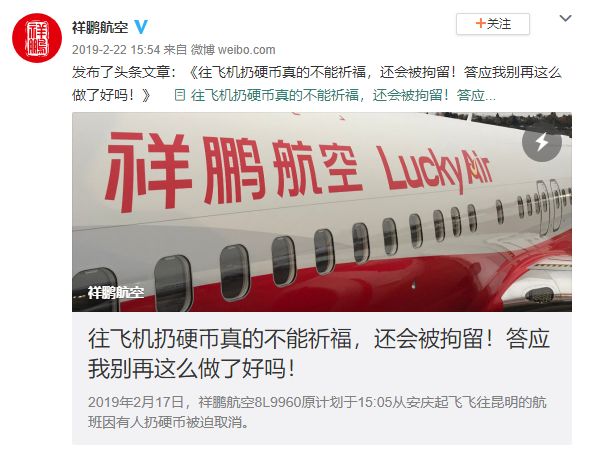"乘客乘机时向飞机扔硬币的事件已经发生过多次,异物被吸入飞机发动机造成重大事故,此前也发生过。"乔善勋建议,主管部门、航空公司和大众媒体等各方应该做好航空科普工作,避免这类低级的无知行为重复发生。