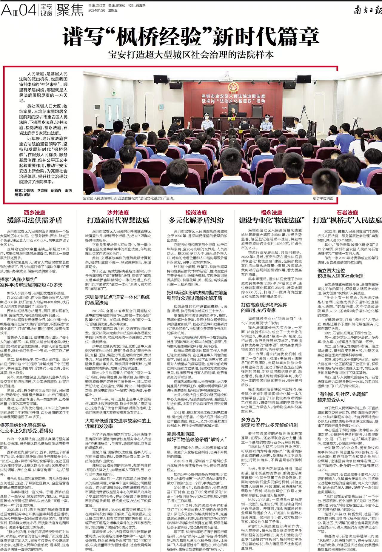 近年来,这5家法庭在宝安法院的坚强领导下,坚持和发展新时代“枫桥经验”,在服务人民群众、服务基层治理、维护公平正义中起着重要作用,推动平安宝安迈上新台阶,为完善社会治理体系、提升社会治理效能提供了法院样本。