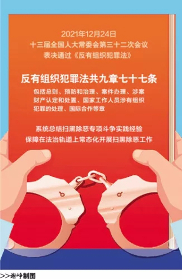 这部法律总结扫黑除恶专项斗争经验,明确反有组织犯罪“坚持与反腐败相结合”,已经成为在法治轨道上常态化、机制化开展扫黑除恶工作的重要举措。《反有组织犯罪法》的出台,对于建设更高水平的平安中国、法治中国,不断增强人民群众的获得感、幸福感、安全感,确保人民安居乐业、社会安定有序、国家长治久安,具有重大意义。