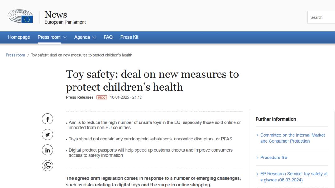 新闻稿全文链接(点击底部阅读原文可直接访问):https://www.europarl.europa.eu/news/en/press-room/20250407IPR27704/toy-safety-deal-on-new-measures-to-protect-children-s-health
