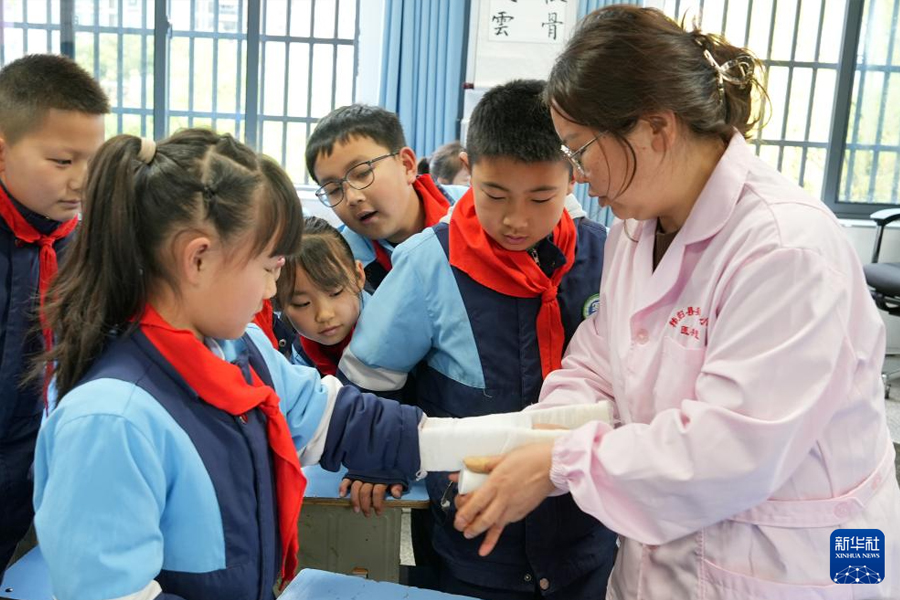 3月25日,在湖北省宜昌市秭归县实验小学,医务人员马洪珍在教小学生救护包扎方法。(新华社发 王辉富/摄)
