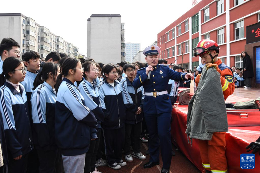 3月25日,在河南省济源市北海中学,济源市消防救援支队的消防员向学生讲解如何快速穿戴灭火防护装备。(新华社发 苗秋闹/摄)