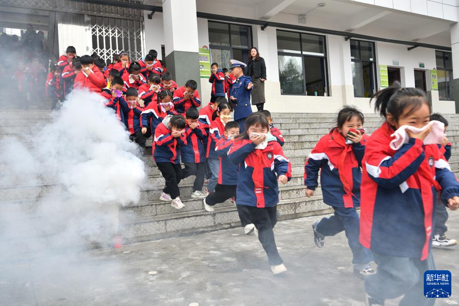 3月25日,在湖北省襄阳市保康县实验小学,学生进行消防应急逃生演练。(新华社发 杨韬/摄)