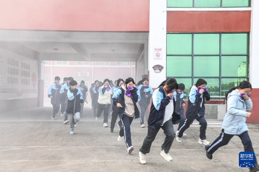 3月25日,在河南省济源市北海中学,学生进行消防应急逃生演练。当日是全国中小学生安全教育日。各地举行种类多样的安全教育主题活动,提高学生的安全防范意识,增强学生的自我防护能力,保障学生健康成长。(新华社发 苗秋闹/摄)