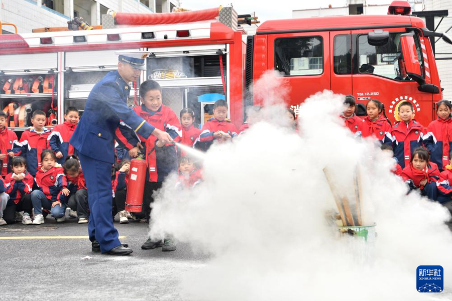 3月25日,在湖北省襄阳市保康县实验小学,保康县消防救援大队的消防员指导学生使用灭火器灭火。(新华社发 杨韬/摄)