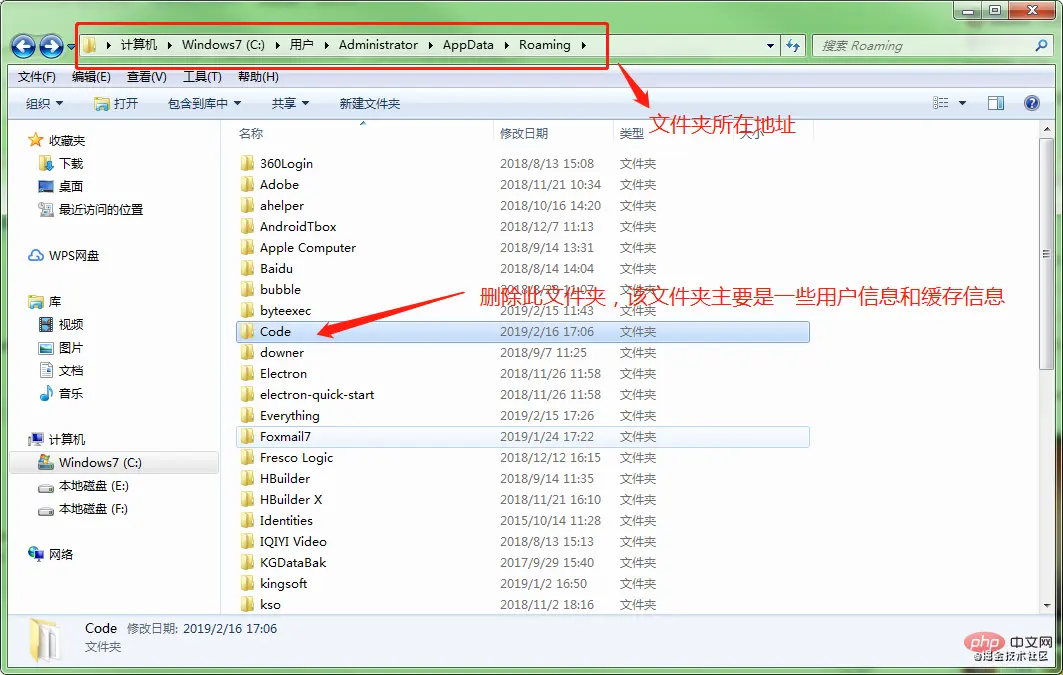 3.在 C:\Users\Administrator\AppData\Roaming\Code 下,删除 Code 文件。