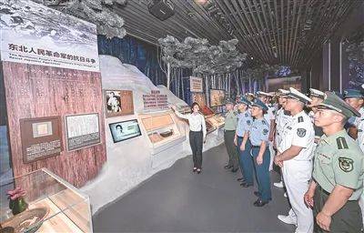 2025年7月7日上午,纪念全民族抗战爆发88周年仪式暨《为了民族解放与世界和平》主题展览开幕式在中国人民抗日战争纪念馆举行。图为当日,解放军官兵参观主题展览(新华社记者 陈晔华 摄)