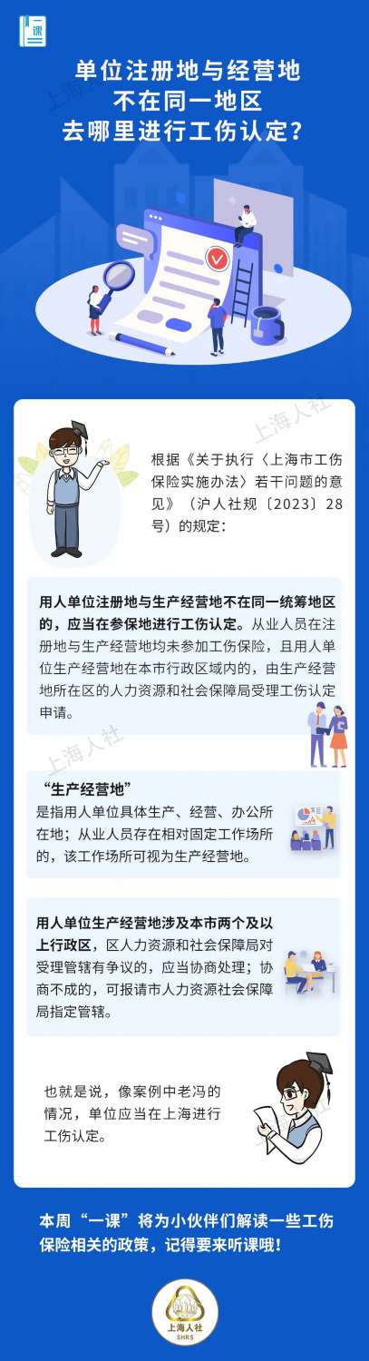 老冯是本市一家食品加工企业的质检员,一直在苏州昆山的工厂工作。去年年底,老冯在工厂工作时被货物砸伤。送医救治后,企业HR便准备第一时间申请工伤认定。但老冯常年在昆山工作,工伤也发生在昆山工厂,但企业注册在上海,社保也交在上海。像这种情形,到底该去哪里进行工伤认定呢?