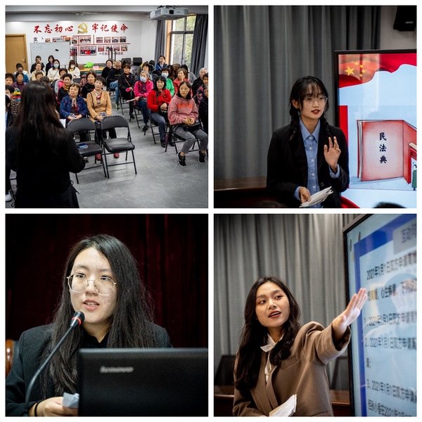 近日,我校法律学院民法典青年宣讲团走进夏阳街道,向东方社区、塘郁村、佳乐苑社区的居民群众进行民法典专题宣讲,以青年之声弘法、以青春之我服务社会。