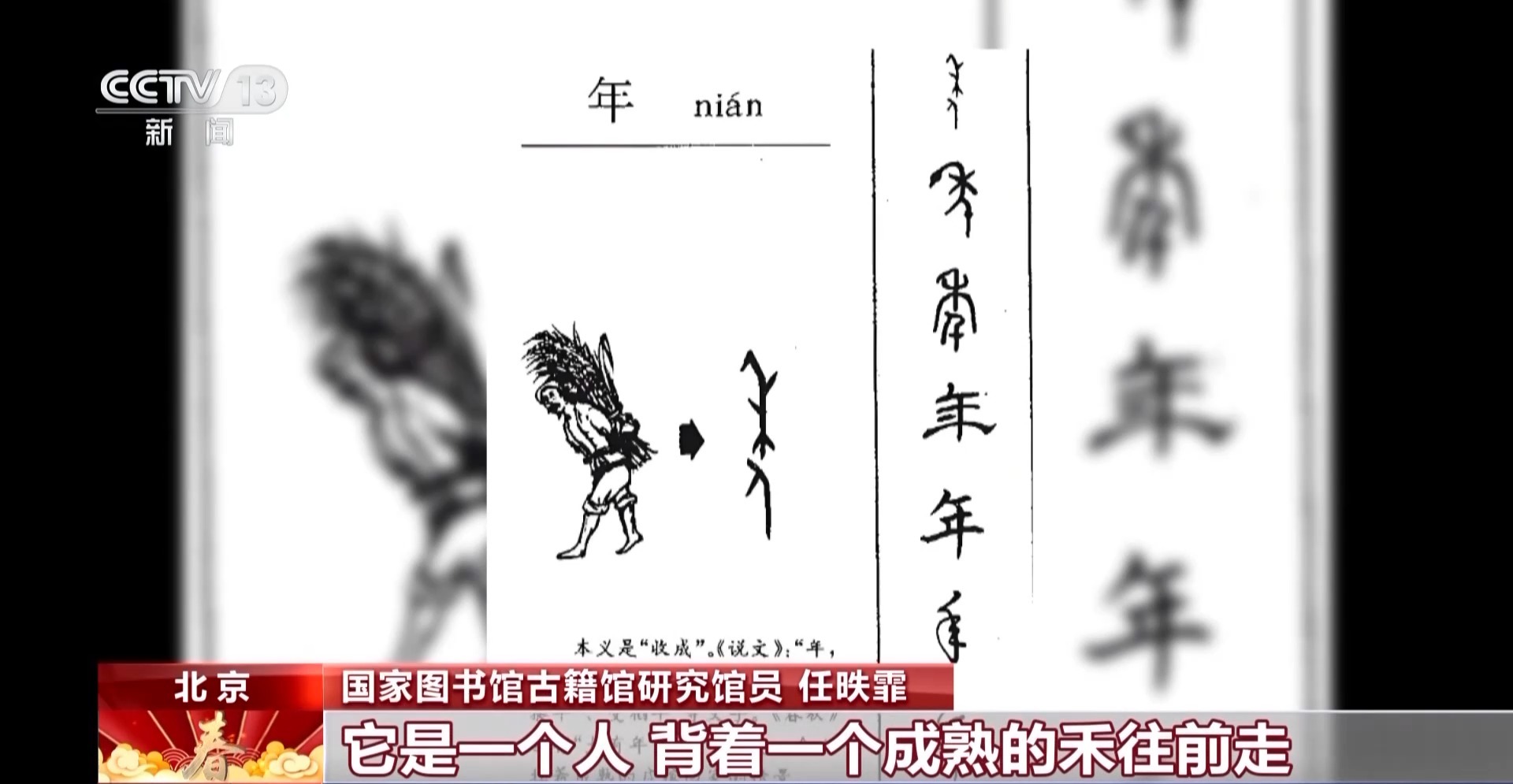 国家图书馆古籍馆研究馆员 任昳霏:“年”最早在甲骨文里面字形是一个人,背着一个成熟的禾往前走,《春秋谷梁传》里有这样的一个说法,叫作五谷皆熟曰有年,五谷大熟曰大有年,“年”的意味和丰收还是挂在一起的。
