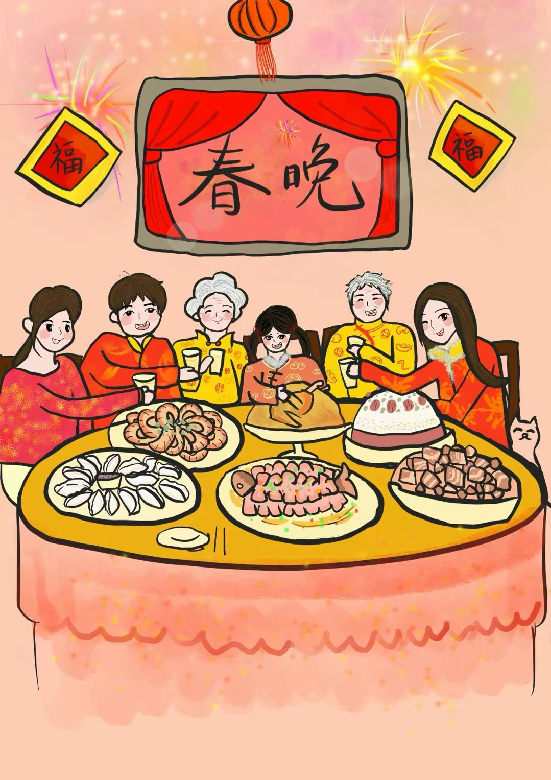 除夕之夜守岁,全家老小欢聚一堂,灯火通明,吃年夜饭,围炉聊天,通宵守夜,把一切邪瘟病疫赶跑驱走,迎接吉祥如意的新年。