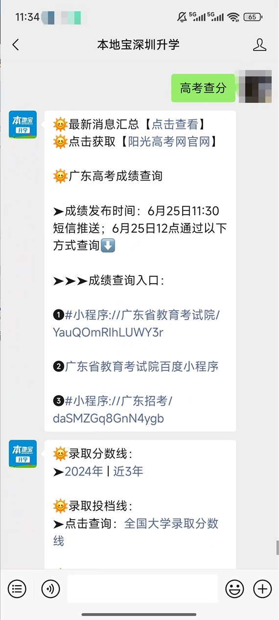 温馨提示:关注微信公众号【本地宝深圳升学】回复【高考查分】获取2025广东高考查分时间+入口、录取分数线、一分一段表、大学专业查询、录取结果查询等最新消息