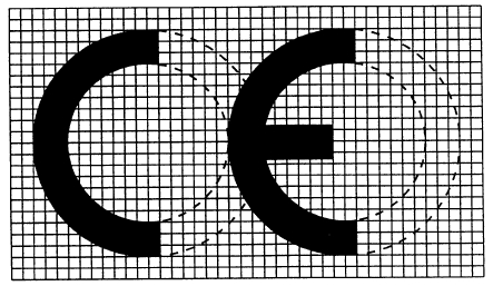 对于CE标志的大小,有包装的规定,其中CE字的高度至少要5mm ,而CE字的长度合计不得超过 12mm,CE字体的宽度,应不少于5分之1。厚度至少要高度的1/5(在此至少要20×1/5=4mm)、外围半径为10mm、内围横柱至少要有外围半径之80%(10×0.8=8mm)。