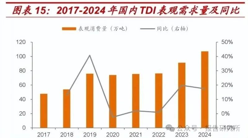 表观消费量稳中有升,下游消费集中于软泡。从表观需求量上看,2024年国内 TDI 表观消费量 107.22 万吨,同比+17.4%。趋势上看,我国TDI 消费量已由 2017 年的 47.75 万吨提升至 2024 年的107.22 万吨,2017-2024年 CAGR 约 12.3%。从下游需求结构上看,根据百川盈孚,软泡领域占比最高,约 78%;其次为涂料、胶黏剂、弹性体领域,分别约8%、6%、6%。
