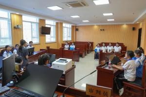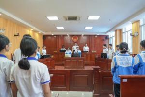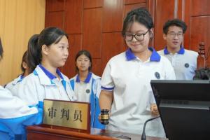在庭审模拟环节,同学们在干警的指导下,化身审判员、书记员、律师、原被告等角色,模拟了民事案件的庭审现场。