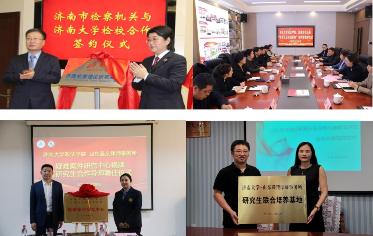 学院建有山东省社科理论重点研究基地(新时代社会治理与政策创新)、民政部全国民政政策理论研究基地、山东省人大常委会地方立法研究服务基地、山东省黄河流域民生保障与社会治理协同创新中心、计算社会科学与数字社会治理山东省高校文科实验室、山东高校慈善文化研究基地、山东省司法厅政府立法研究服务基地、城市治理现代化研究中心、民主法治建设与国家治理现代化研究中心、济南市人民检察院检察理论研究基地、知识产权司法保护理论与实践研究中心等10余个省(部)市级研究平台;建有山东省高等学校青年创新团队等省部级创新团队6个,校级社科研究中心、基地3个。学院牵头成立山东省法学会社会法学研究会、济南市法学会行政法学研究会和市域社会治理研究中心,与济南市司法局、市律师协会合作共建济南律师学院、济南国际法律服务研究院。济南大学MPA教育中心、济南大学公共管理培训中心挂靠政法学院,获批第二批山东省社会工作专业人才培训基地、山东省妇女/性别研究与培训基地。