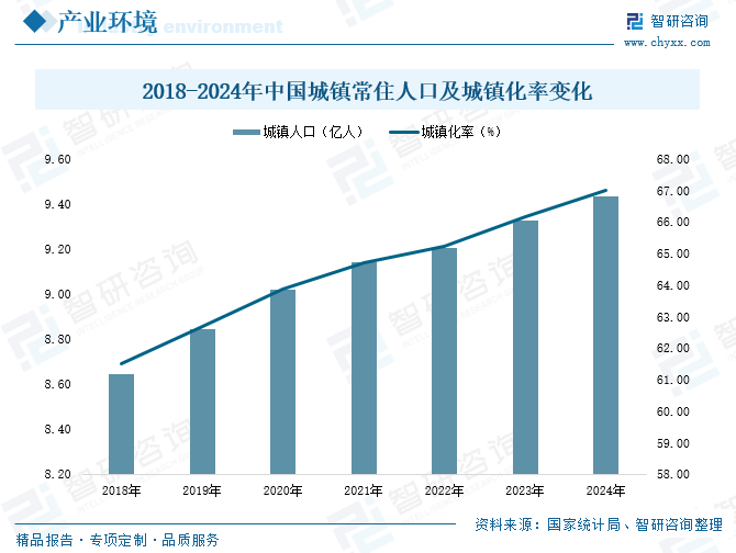 近年来我国城镇化进程加速推进,国内城镇常住人口数量不断增加,国家城镇化率持续提升。据统计,2024年,我国城镇常住人口数量已从2018年的8.64亿人增长至9.44亿人;全国城镇化率已从2018年的61.5%提升至67%。伴随着城镇化率上升,农村人口持续向城镇聚集,城市道路清扫面积、公共厕所数量持续增长,同时也带来大量生活垃圾,清运工作量庞大,为城市环卫行业带来大量需求和持续发展动力。