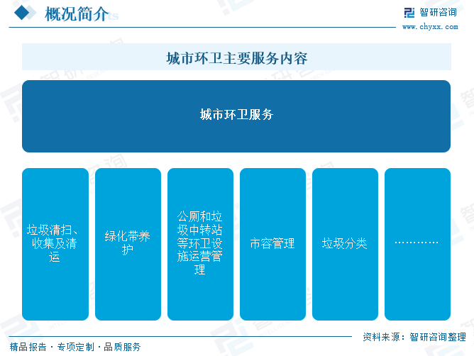 城市环卫又名市政环卫,主要指的是对市政道路、广场、水域、公厕、垃圾中转站等各类城乡公共区域的环境卫生进行综合管理,主要服务内容包括但不限于,垃圾清扫、收集、垃圾清运、绿化带养护、公厕和垃圾中转站等环卫设施运营管理、市容管理、垃圾分类、重大活动环卫保障等。