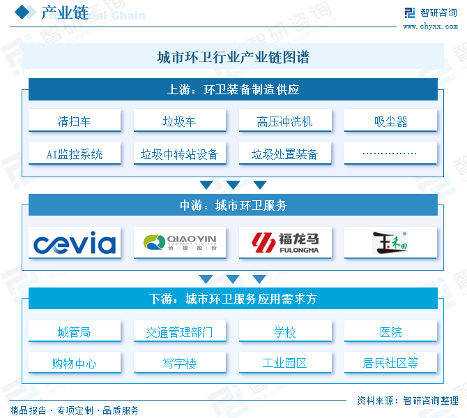 城市环卫行业产业链上游为环卫装备制造供应环节,主要包括清扫车、垃圾车等环卫车辆,高压冲洗机、吸尘器等清洁设备,AI监控系统等智能硬件,以及垃圾中转站设备、垃圾处置装备等。产业链中游为城市环卫服务环节,代表厂商有玉禾田、福龙马、启迪环境、城发环境等。产业链下游为城市环卫服务应用需求方,主要包括城管局、市容环境卫生管理局、交通管理部门等政府部门,学校、医院、城市公园等公共机构,购物中心、写字楼、酒店、工业园区等商业机构,以及居民社区等。