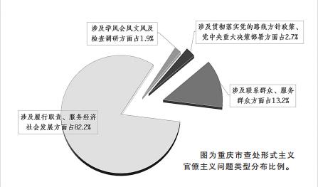 2019年,重庆市累计查处基层反映突出的形式主义官僚主义问题1375件,处理2202人,其中给予党纪政务处分567人。在查处问题中,涉及贯彻落实党的路线方针政策、党中央重大决策部署方面36件,涉及联系群众、服务群众方面182件,涉及履行职责、服务经济社会发展方面1131件,涉及学风会风文风及检查调研方面26件。