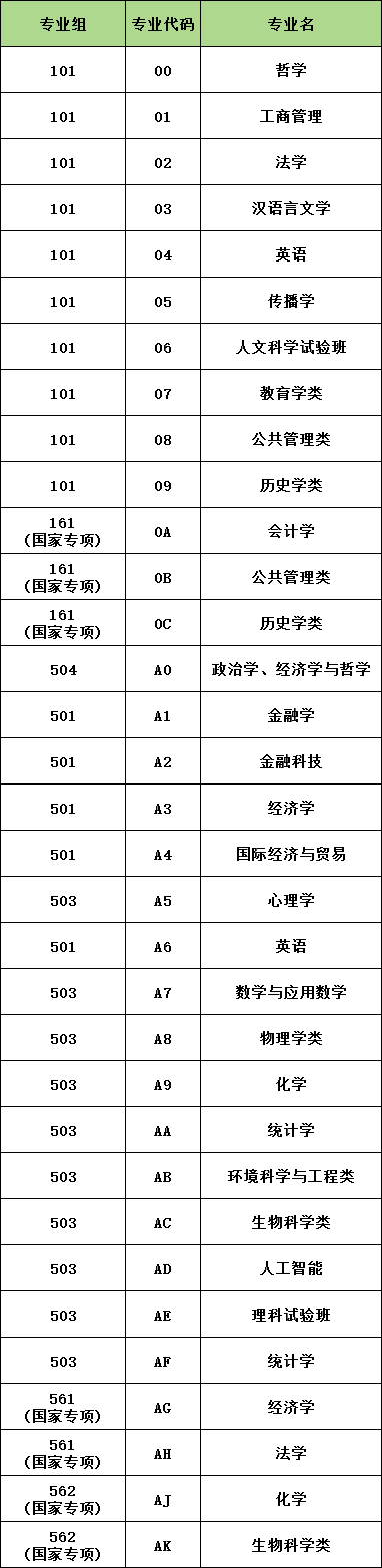 全国各大学在江西招生的专业代码各不相同,一般而言,专业代码为2位数,同一专业不同专业方向的代码也会有差异。以北京师范大学为例,第101专业组工商管理专业代码是01、法学专业代码是02、汉语言文学专业代码是03等。篇幅有限,这里仅列举北京师范大学的本科志愿填报专业代码,以供参考:
