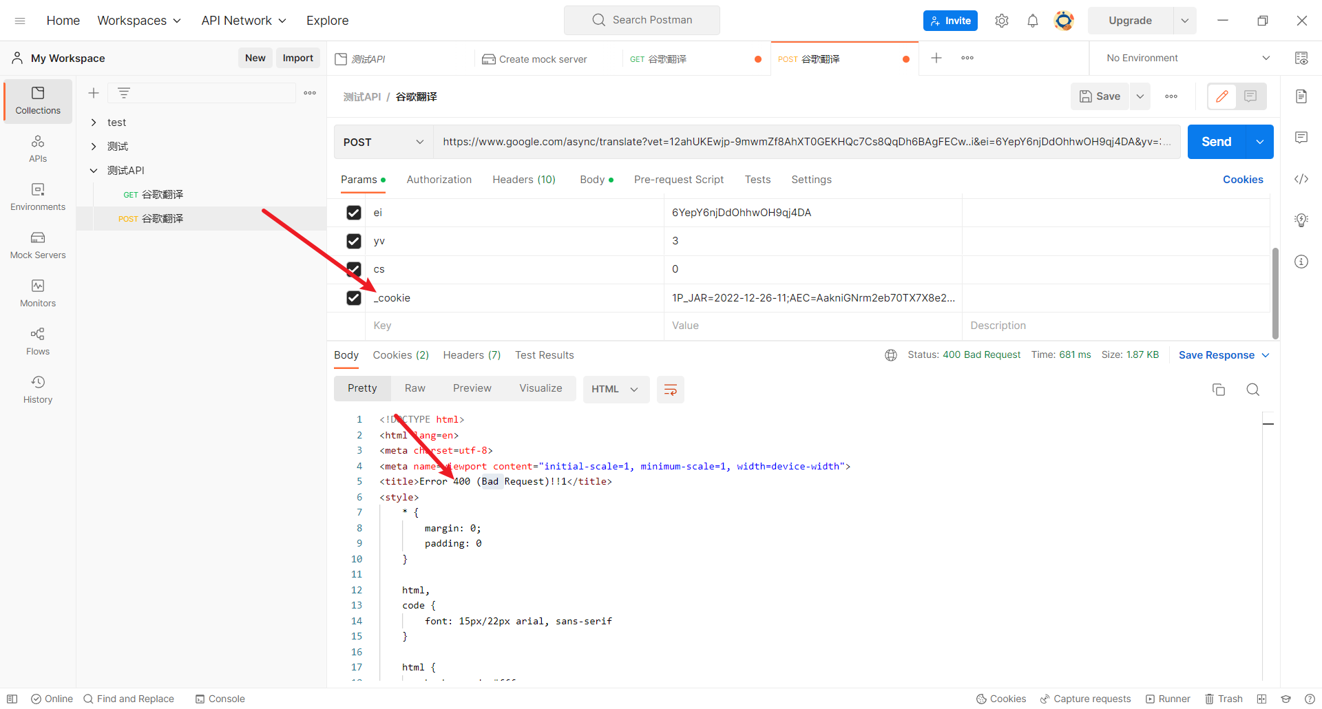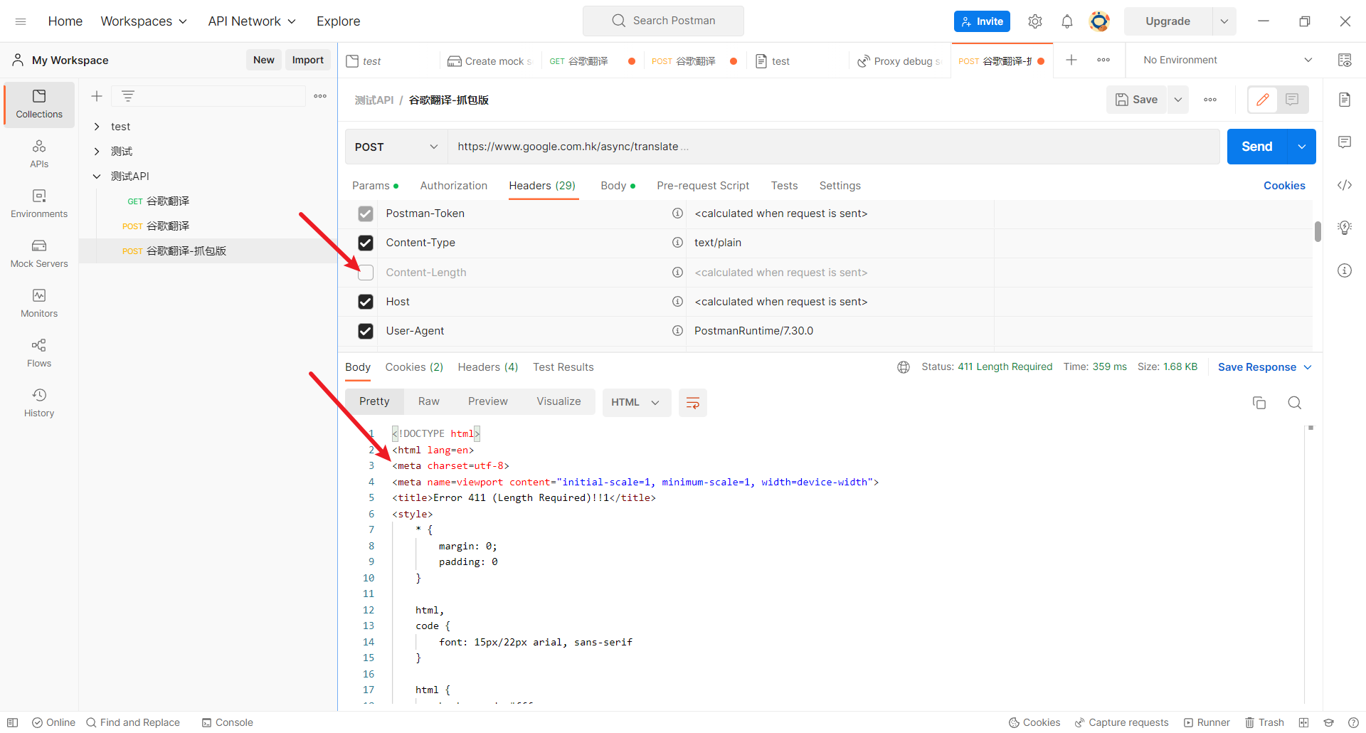 代码 import requests url = "https://www.google.com.hk/async/translate" payload = "async=translate,sl:en,tl:zh-CN,st:1111,id:1672056488960,qc:true,ac:true,_id:tw-async-translate,_pms:s,_fmt:pc" headers = {   'sec-ch-ua': '"Not?A_Brand";v="8", "Chromium";v="108", "Google Chrome";v="108"',   'DNT': '1',   'sec-ch-ua-mobile': '?0',   'User-Agent': 'Mozilla/5.0 (Windows NT 10.0; Win64; x64) AppleWebKit/537.36 (KHTML, like Gecko) Chrome/108.0.0.0 Safari/537.36',   'sec-ch-ua-arch': '"x86"',   'sec-ch-ua-full-version': '"108.0.5359.125"',   'Content-Type': 'application/x-www-form-urlencoded;charset=UTF-8',   'sec-ch-ua-platform-version': '"10.0.0"',   'sec-ch-ua-full-version-list': '"Not?A_Brand";v="8.0.0.0", "Chromium";v="108.0.5359.125", "Google Chrome";v="108.0.5359.125"',   'sec-ch-ua-bitness': '"64"',   'sec-ch-ua-model': '',   'sec-ch-ua-wow64': '?0',   'sec-ch-ua-platform': '"Windows"',   'Accept': '*/*',   'X-Client-Data': 'CKW1yQEIhbbJAQiktskBCMS2yQEIqZ3KAQjb08oBCLD+ygEIlaHLAQjv8swBCN75zAEI5PrMAQjxgM0BCLKCzQEI7ILNAQjIhM0BCO+EzQEIt4XNAQ==',   'Sec-Fetch-Site': 'same-origin',   'Sec-Fetch-Mode': 'cors',   'Sec-Fetch-Dest': 'empty',   'host': 'www.google.com.hk',   'Cookie': '1P_JAR=2022-12-26-12; NID=511=eVLI1bG9nhyOZtqU14JBHm5Be00epdxfR4XmfQeehYyIkzgpXi6dbpNY75ZMVyS7aOjoM2oZ5WdoR8eNq6wi1-e_J0NeoyI0dtsHW-_8Ik4PGrqvuGHdcvVC03zTOEK2TY1FZL85Wimo_ZPIE3hGIrmGPSiel6-rRRW9lD30UPs' } response = requests.request("POST", url, headers=headers, data=payload) print(response.text)