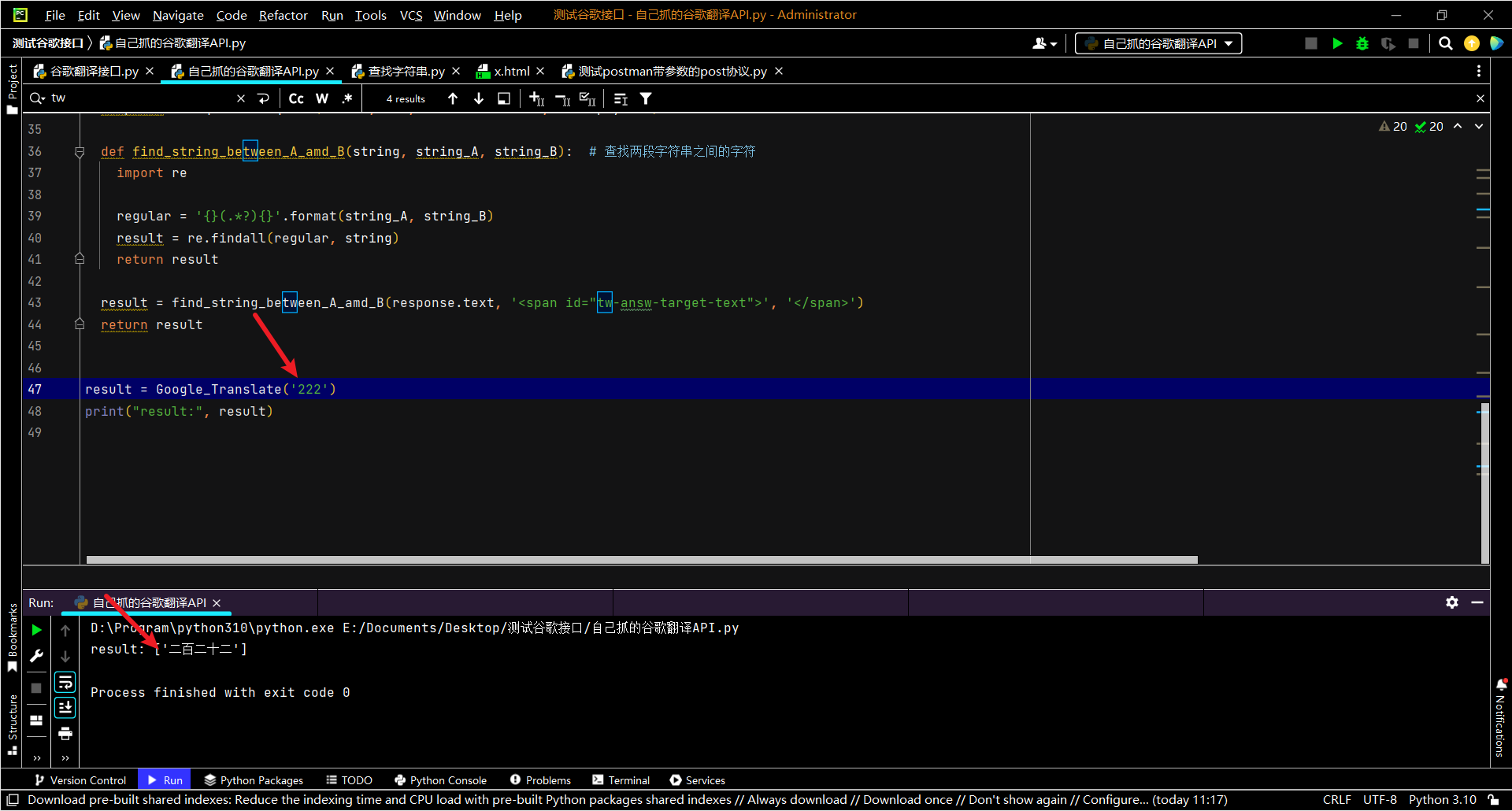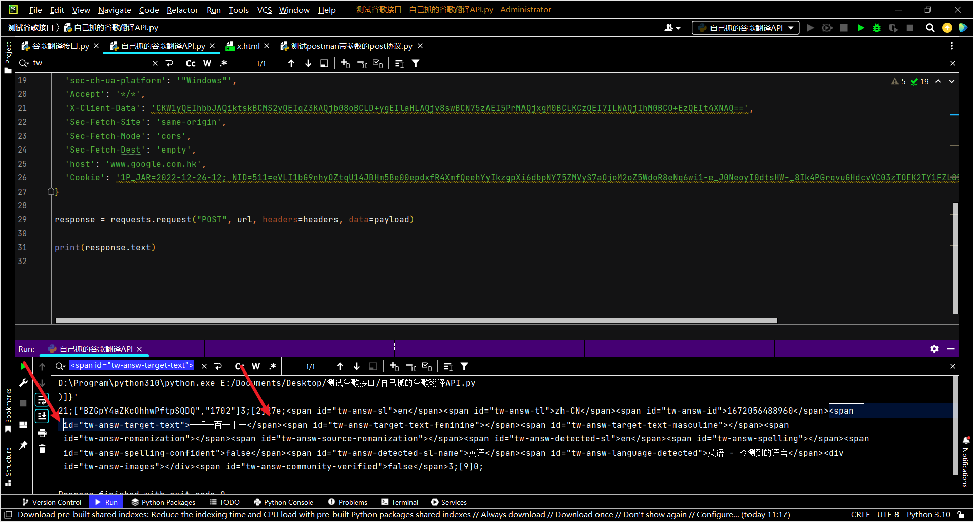 完整代码 def Google_Translate(origin_string):   import requests   url = "https://www.google.com.hk/async/translate"   payload = "async=translate,sl:en,tl:zh-CN,st:{},id:1672056488960,qc:true,ac:true,_id:tw-async-translate,_pms:s,_fmt:pc".format(origin_string)   headers = {     'sec-ch-ua': '"Not?A_Brand";v="8", "Chromium";v="108", "Google Chrome";v="108"',     'DNT': '1',     'sec-ch-ua-mobile': '?0',     'User-Agent': 'Mozilla/5.0 (Windows NT 10.0; Win64; x64) AppleWebKit/537.36 (KHTML, like Gecko) Chrome/108.0.0.0 Safari/537.36',     'sec-ch-ua-arch': '"x86"',     'sec-ch-ua-full-version': '"108.0.5359.125"',     'Content-Type': 'application/x-www-form-urlencoded;charset=UTF-8',     'sec-ch-ua-platform-version': '"10.0.0"',     'sec-ch-ua-full-version-list': '"Not?A_Brand";v="8.0.0.0", "Chromium";v="108.0.5359.125", "Google Chrome";v="108.0.5359.125"',     'sec-ch-ua-bitness': '"64"',     'sec-ch-ua-model': '',     'sec-ch-ua-wow64': '?0',     'sec-ch-ua-platform': '"Windows"',     'Accept': '*/*',     'X-Client-Data': 'CKW1yQEIhbbJAQiktskBCMS2yQEIqZ3KAQjb08oBCLD+ygEIlaHLAQjv8swBCN75zAEI5PrMAQjxgM0BCLKCzQEI7ILNAQjIhM0BCO+EzQEIt4XNAQ==',     'Sec-Fetch-Site': 'same-origin',     'Sec-Fetch-Mode': 'cors',     'Sec-Fetch-Dest': 'empty',     'host': 'www.google.com.hk',     'Cookie': '1P_JAR=2022-12-26-12; NID=511=eVLI1bG9nhyOZtqU14JBHm5Be00epdxfR4XmfQeehYyIkzgpXi6dbpNY75ZMVyS7aOjoM2oZ5WdoR8eNq6wi1-e_J0NeoyI0dtsHW-_8Ik4PGrqvuGHdcvVC03zTOEK2TY1FZL85Wimo_ZPIE3hGIrmGPSiel6-rRRW9lD30UPs'   }   response = requests.request("POST", url, headers=headers, data=payload)   def find_string_between_A_amd_B(string, string_A, string_B):  # 查找两段字符串之间的字符     import re     regular = '{}(.*?){}'.format(string_A, string_B)     result = re.findall(regular, string)     return result   result = find_string_between_A_amd_B(response.text, '', '')   return result result = Google_Translate('222') print("result:", result)