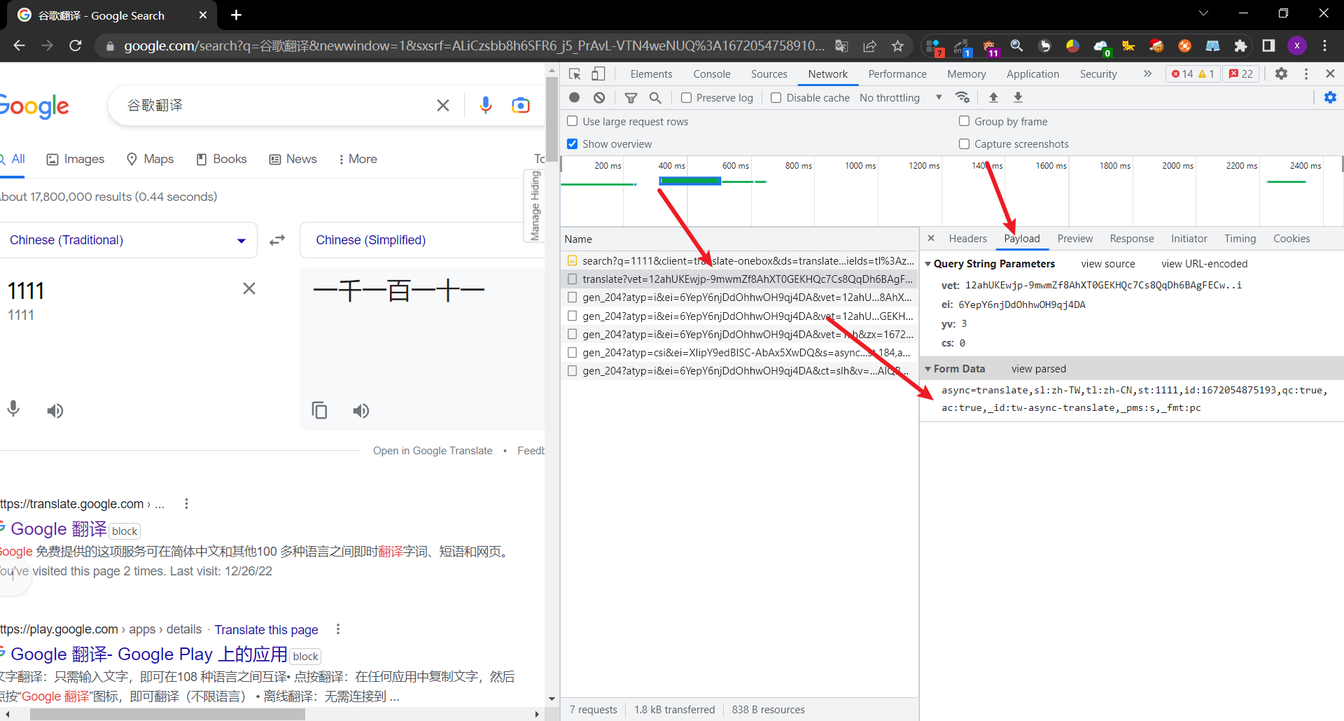 上面的方法是适用的,只不过是现在这个接口没有以前好找了,我们使用谷歌搜索引擎上提供的谷歌翻译来找这个接口