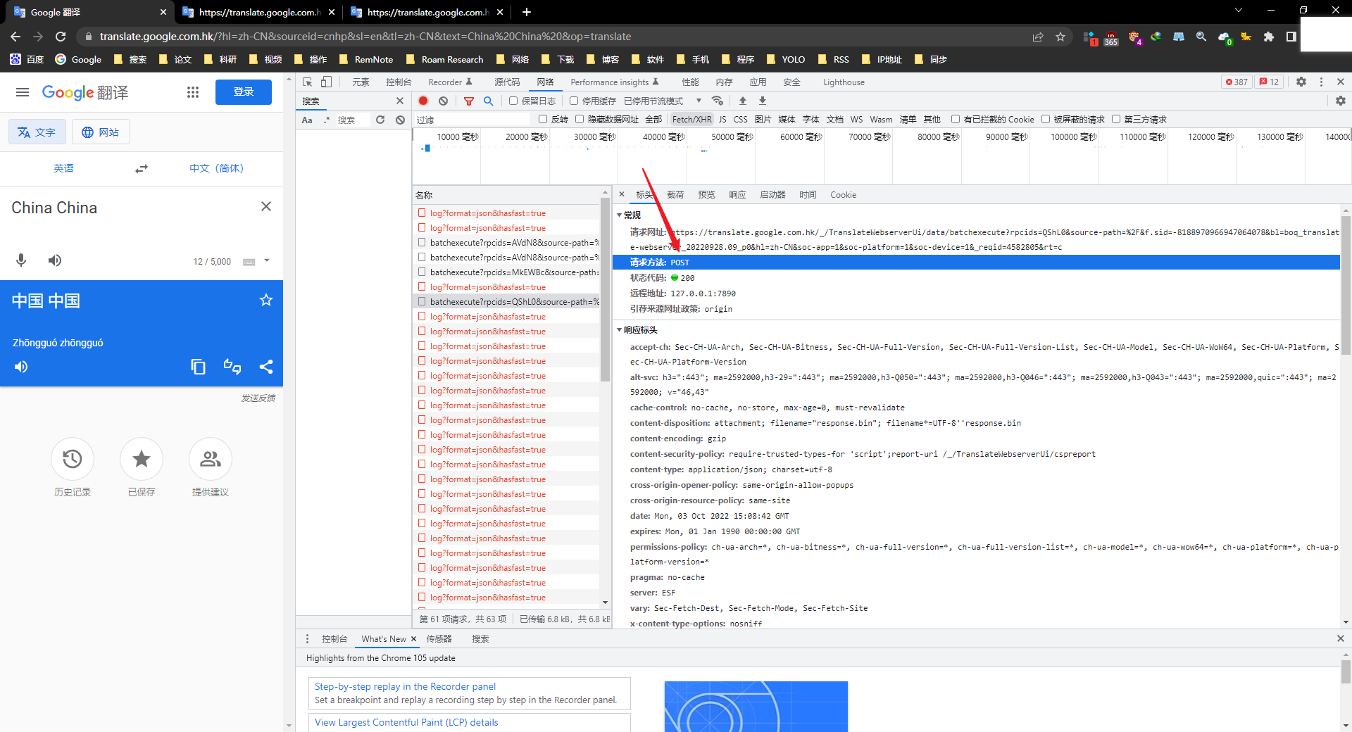 谷歌翻译大约每秒会请求一次,我们很快就可以得到谷歌服务器返回给我们的翻译结果,经过排查,下面的这个batchexecute开头的请求就是我们需要的,