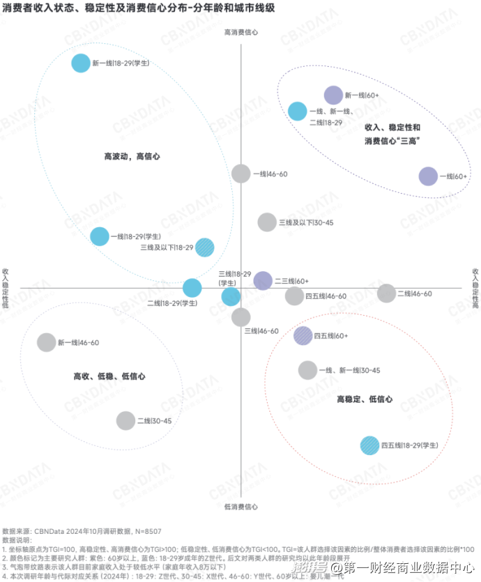 在需求侧,银发族与Z世代正合力引领中国消费支出攀升。CBNData将划分不同城市线级、代际的人群,根据消费意愿与收入稳定性进行对比分析,深入洞察不同人群尤其是60岁以上银发和Z世代的消费特点和行为变化,以更清晰地理解高消费潜力群体在消费选择上的差异及其背后的影响因素。