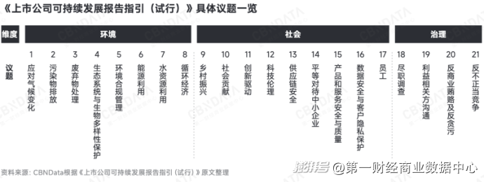 ESG具体包含哪些重点议题?根据A股《上市公司可持续发展报告指引(试行)》,企业的ESG相关信息披露需要包含环境、社会和治理三大维度下共计21项具体议题。