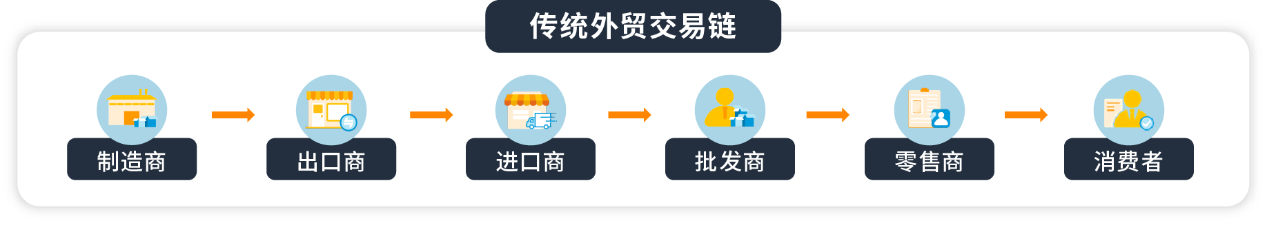 在整个贸易交易链条中,传统工厂是最直接的生产源头,也可以理解为上图中的制造商。具体来说又可分为以生产为主的内贸型工厂,以及工贸一体、参与生产和出口销售环节的外贸型工厂。制造商想要将产品售卖给消费者,将经过出口商、进口商、批发商、零售商等众多的环节。链条中某个环节的实体,通常只能和这个环节的上游或是下游打交道。