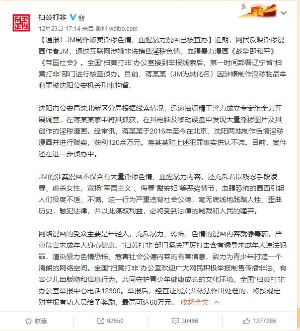 12月23日,全国“扫黄打非”办公室通报,淫秽漫画作者JM涉嫌通过互联网非法销售淫秽色情、血腥暴力漫画,其漫画还充斥着以残忍手段凌辱、虐杀女性,宣扬“军国主义”、侮辱“慰安妇”等恶劣情节。目前,蒋某某(JM为其化名)因涉嫌制作淫秽物品牟利罪被沈阳公安机关刑事拘留。