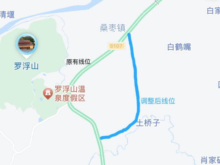 该路段将原普通省道4公里(三级公路)调整为桑枣镇罗浮山温泉康养小镇环线公路3.6公里,该路段的改线提升了道路等级,绕行桑枣场镇,避开群众出行主要干道,提高了群众出行安全性。
