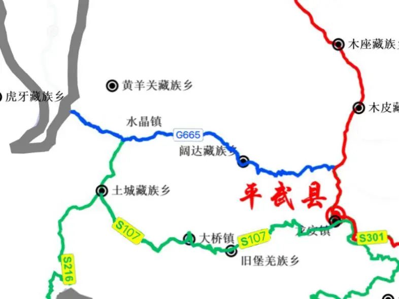 新增G665线起点为平武县城,终点为松潘县川主寺镇,全长134公里,绵阳境内约47公里,境内经过平武县、阔达藏族乡、水晶镇,全段利用普通省道(S301)。目前G665项目提升改造工程正在加快建设,建成后将进一步改善平武与阿坝松潘地区的互联互通水平。