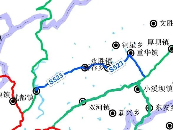 新增S523线起于江油市武都镇,经永胜镇、新春乡、重华镇,止于江油市小溪坝镇,全长34公里,全段利用农村公路(分别是X142、X129、X140)。新增S523线实现了永胜镇、新春乡、重华镇国省道覆盖。