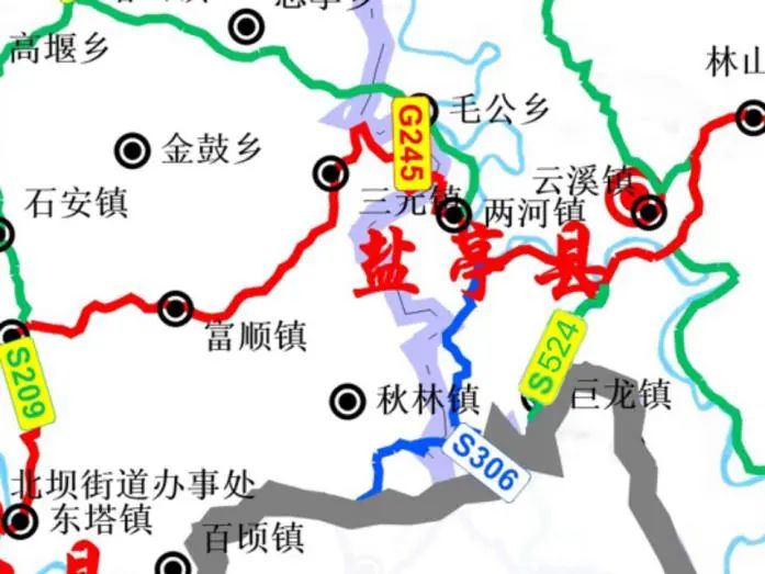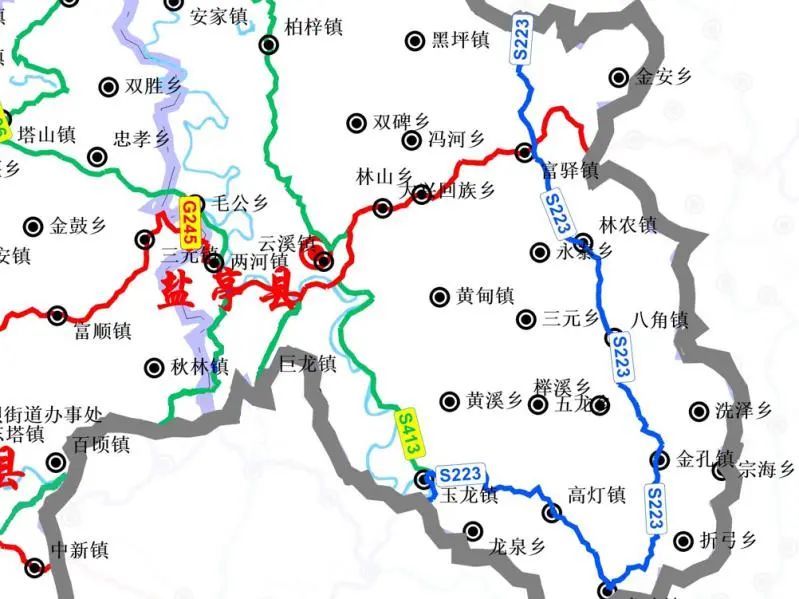 新增S223线起点为南部县大坪镇,终点为遂宁市安居区老池乡(川渝界),全长208公里,绵阳境内约74公里,经过盐亭县富驿镇、九龙镇、金孔镇、西陵镇、玉龙镇,其中九龙镇、金孔镇、西陵镇实现了国省道“从无到有”的转变。
