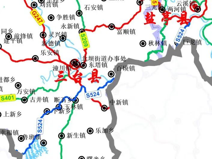 新增S524线起点为德阳市旌阳区天元镇,终点为盐亭县高渠镇,全长178.7公里,我市境内约75公里,经过三台县鲁班镇、下新乡、玉林镇、断石乡、三台县,在三台县白倾镇附近接S524线遂宁射洪段,后在盐亭县巨龙镇回到绵阳,止于盐亭县高渠镇。新增的省道S524串联起了鲁班镇、下新乡、玉林镇和巨龙镇及射洪部分区域,将进一步强化三台县、盐亭县与射洪市的县域联系。