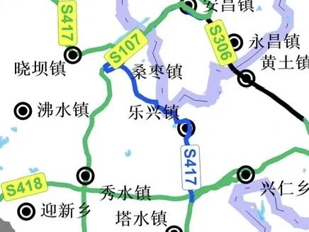 延伸路线起于桑枣镇,经乐兴镇,止于塔水镇,新增普通省道里程16.0公里,延伸路段均利用原农村公路(C001、X038、X041)。该线位的调整将实现S417与S107、S108、S418等普通省道的联网互通,扩大沿线景区景点和旅游产业辐射面。