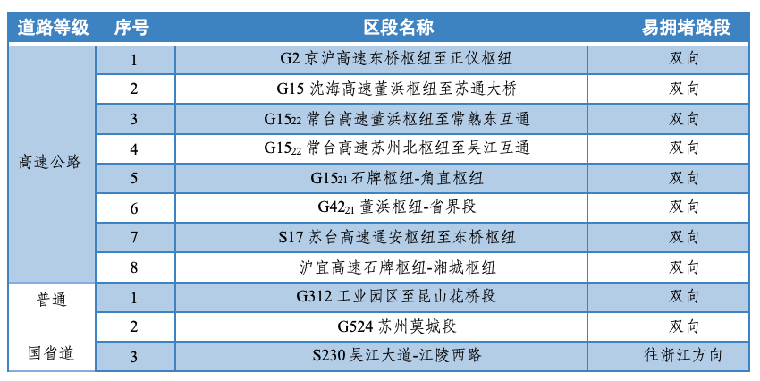 1 G15沈海高速董浜枢纽至苏沪省界(K1218+233-K1251+495)封闭往上海方向车道;封闭董浜枢纽G42₂₁南京转G15往南通、苏州方向,G15上海转G15₂₂往苏州方向,G15南通转G42₂₁南京、上海方向,G15₂₂苏州转G15上海、南京方向匝道;封闭沙溪枢纽S80转G15上海方向和G15双向转S80匝道;封闭太仓北枢纽S48双向转G15匝道、G15上海方向转S48匝道。