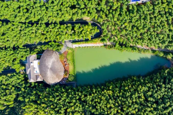 竹海连绵起伏,湖水澄澈如镜