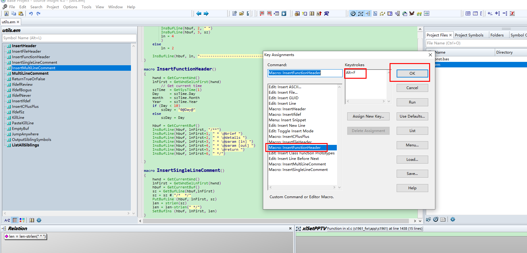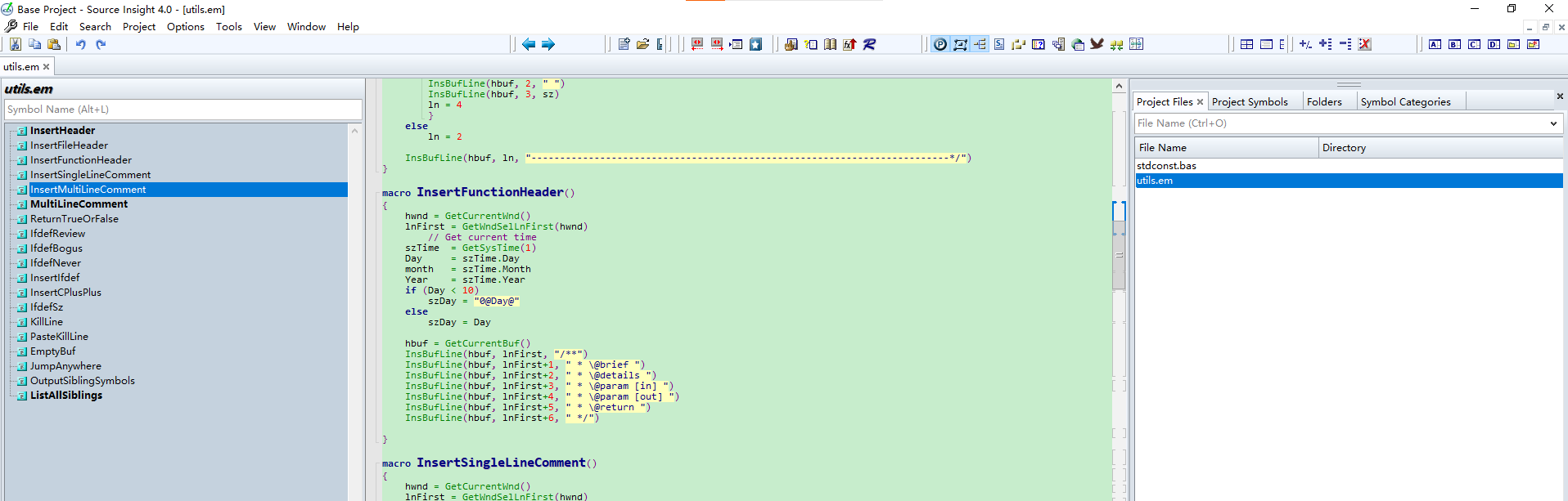 第一步打开source insight的base工程,然后打开utils.em文件,将本文最后的三个function拷贝进去,并保存