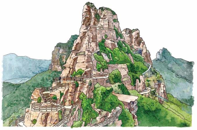 巍巍太行之东,藏着大地最炽热的告白。乘索道穿云而上,脚下是刀削斧劈的绝壁,身旁是翻涌的雾海,忽然一阵风吹过,云海散开,万亩松林在山坳里铺成绿毯,红岩栈道如赤色丝带缠绕峰峦,最险处仅容一人侧身而过,低头可见深渊万丈,抬头便是澄碧苍穹。