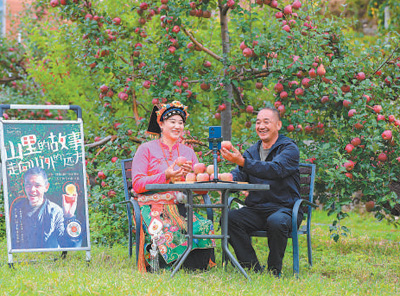 四川省小金县沃日镇木栏村,电商主播同果农一起直播卖苹果。严易程摄(人民视觉)