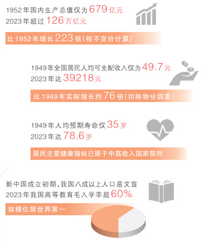 各行各业的发展成就,人民生活的蒸蒸日上,浓缩在一组组数据中。与新中国成立初期相比,2023年国内生产总值增长223倍、人均GDP增长89倍、人均预期寿命提高43.6岁、农村贫困人口全部脱贫……国家统计局近日发布新中国成立75年经济社会发展成就系列报告,“数”说75年伟大成就,本版“大数据观察”栏目推出特别报道,记录同心同德、艰苦奋斗的奋进历程,汇聚共襄强国建设、民族复兴伟业的磅礴力量。