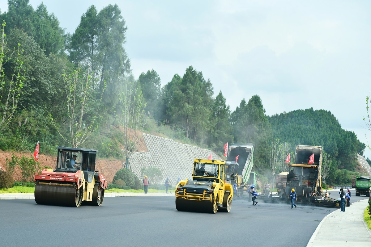 近日,在广绵高速扩容项目梓潼段连接线施工现场,摊铺机、压路机等大型机械有序作业,轰鸣声此起彼伏,一派繁忙景象。