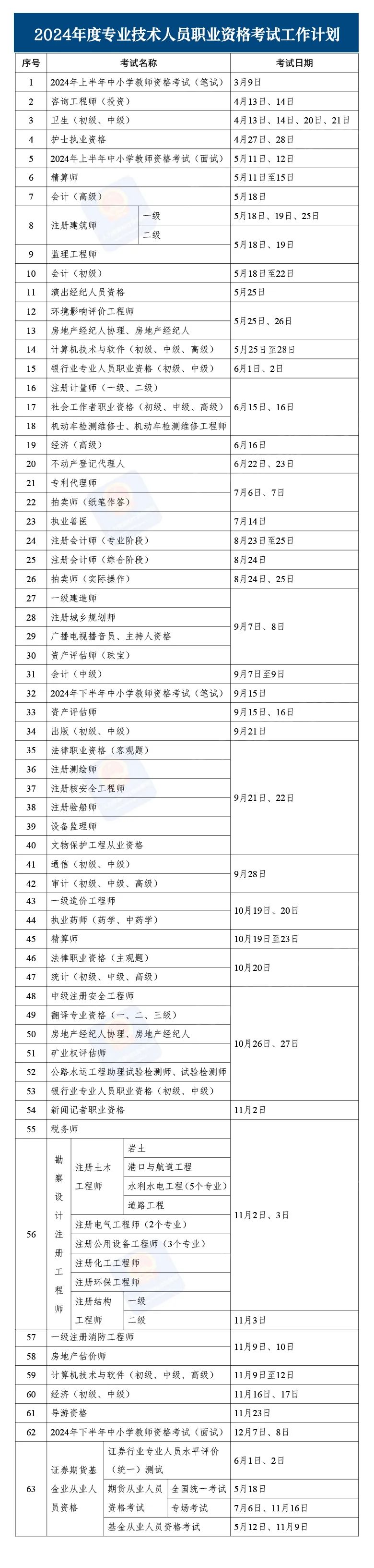 近日,人力资源社会保障部办公厅印发《关于2024年度专业技术人员职业资格考试工作计划及有关事项的通知》。