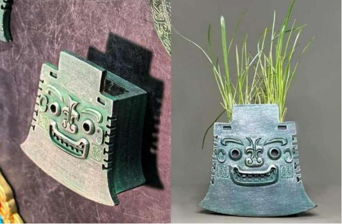 古青铜器也能这么“清新”?以山东博物馆的十大镇馆之一的商代亚丑钺为原型设计,人面五官微突出,双目圆睁,嘴角上扬,露出城墙垛口似的牙。巧妙地将古代青铜器的庄重与现代盆栽的清新相结合,让呆萌的小钺钺长出了“绿油油的头发”。
