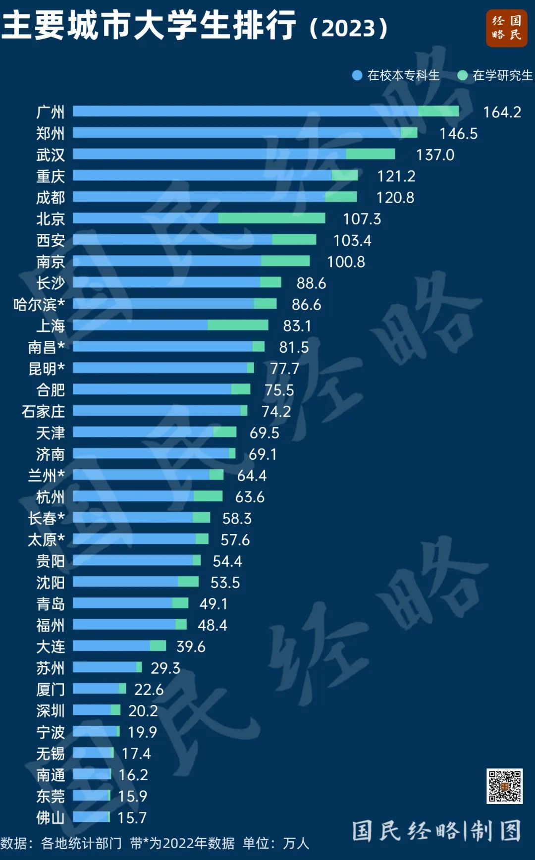 随着各地陆续披露最新统计公报,中国2023年大学生最多的城市正式揭榜。